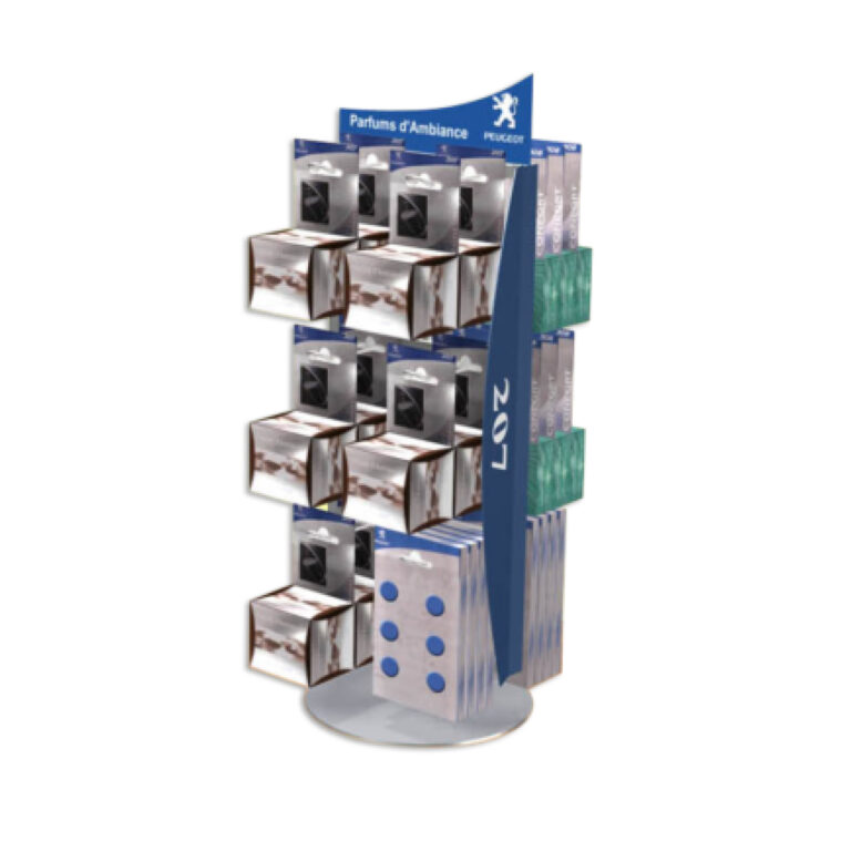 La PLV de comptoir peut également inclure des présentoirs à produits tels que des porte–cartes, des porte–clés ou des porte–broches.